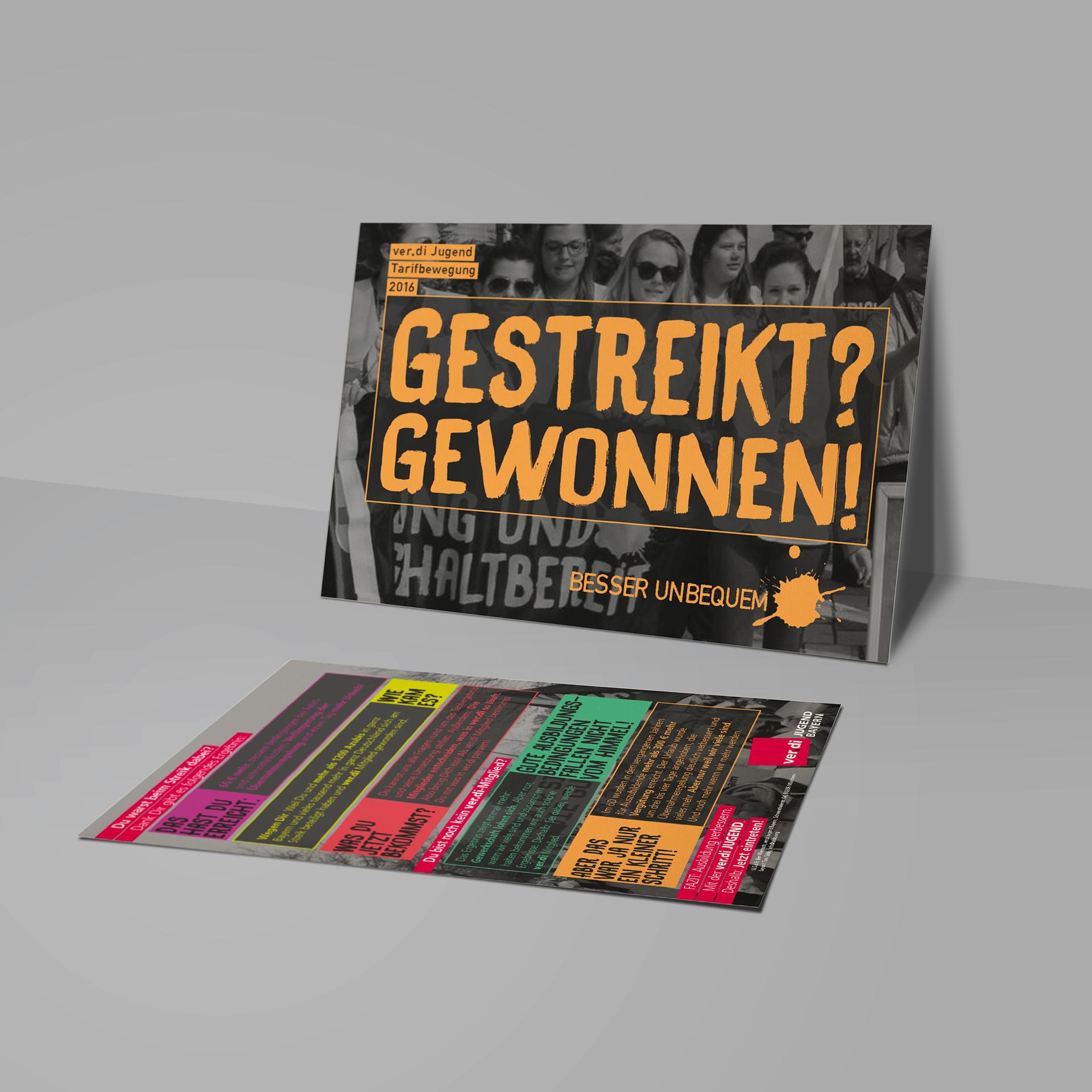 Zum Abschluss der Tarifrunde im öffentlichen Dienst 2016 sollte den Auszubildenden die erreichten Ergebnisse dargestellt werden. Durch 5 einzelne Abschnitte sollten sowohl Mitglieder als auch Nicht-Mitglieder angesprochen werden. Das Design orientiert sich an der #besserunbequem-Kampagne der ver.di Jugend. DIN A6, 2-seitig. Auftraggeber: ver.di Jugend Bayern
