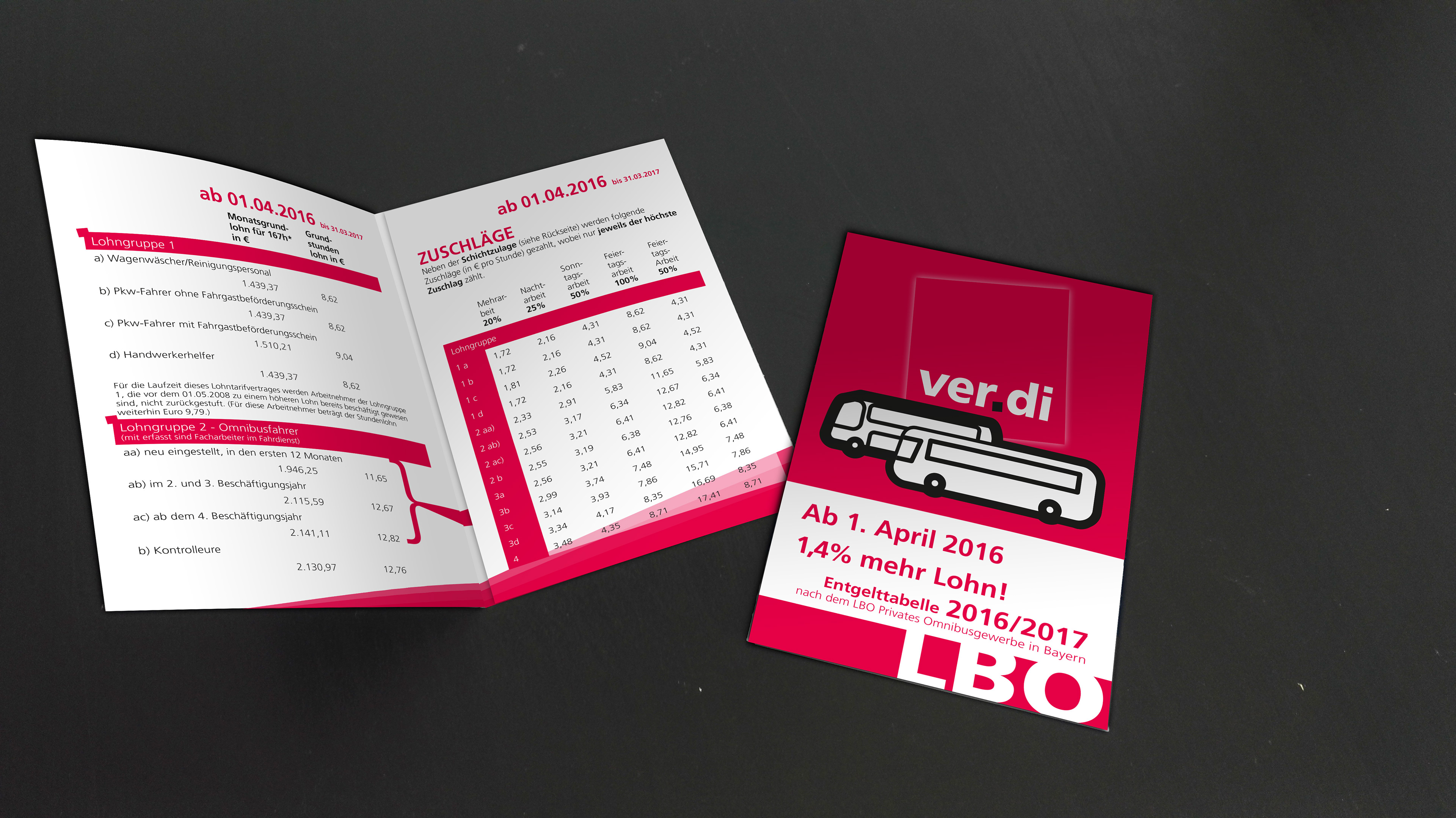 Für alle gewerblichen Arbeitnehmer des privaten Omnibusgewerbes in Bayern gibt die Gewerkschaft ver.di Entgelttabellen des aktuellen Lohntarifvertrags heraus. DIN A7, 6-Seiter, Wickelfalz Auftraggeberin: ver.di Fachbereich Verkehr Bayern