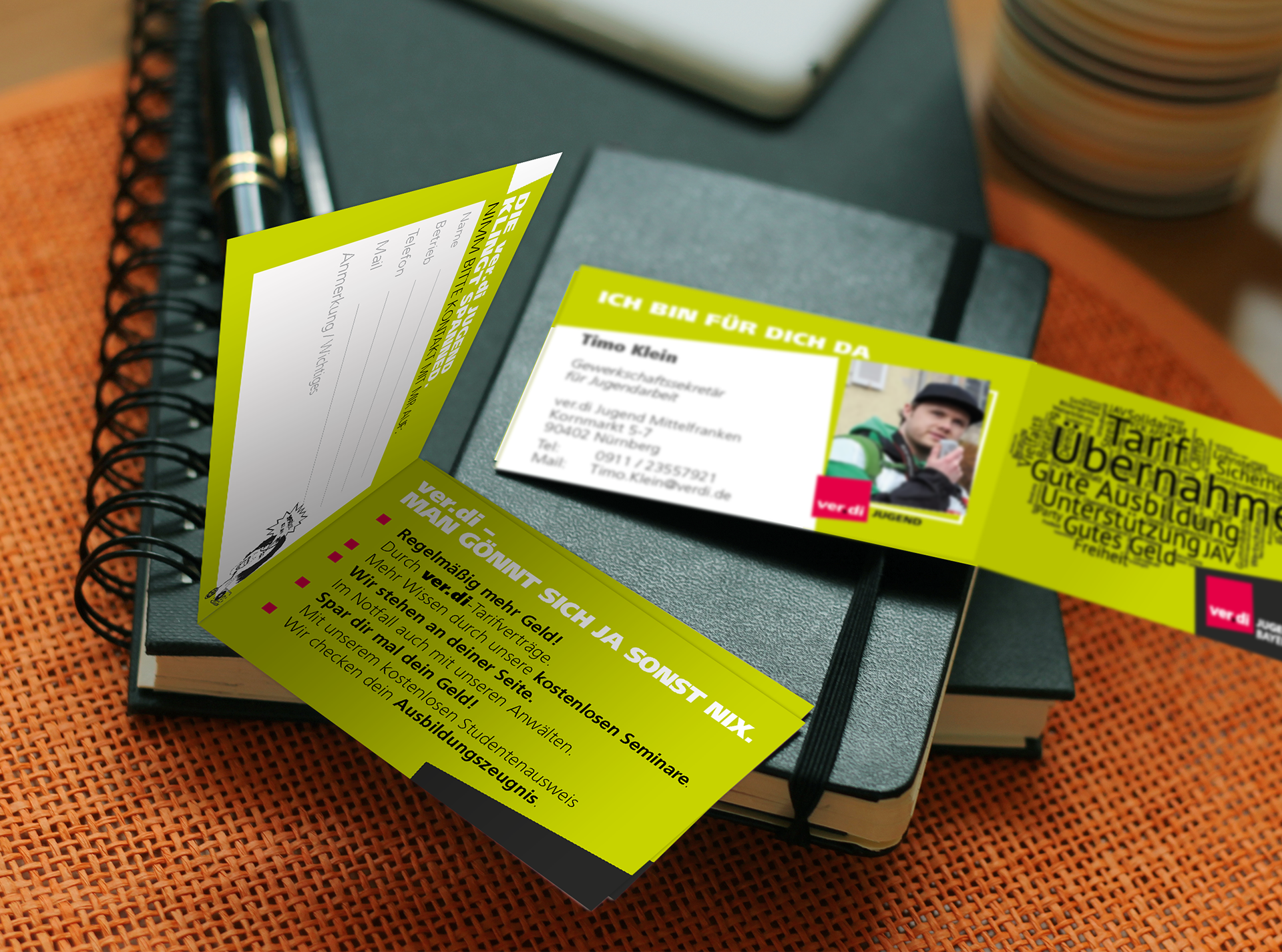 Für alle Jugendsekretäre in Bayern wurden verschiedene Klappvisitenkarten entworfen, die für die Kontaktaufnahme im Betrieb genutzt werden. Format: DINA7 4-Seitig Auftraggeberin: ver.di Jugend Bayern