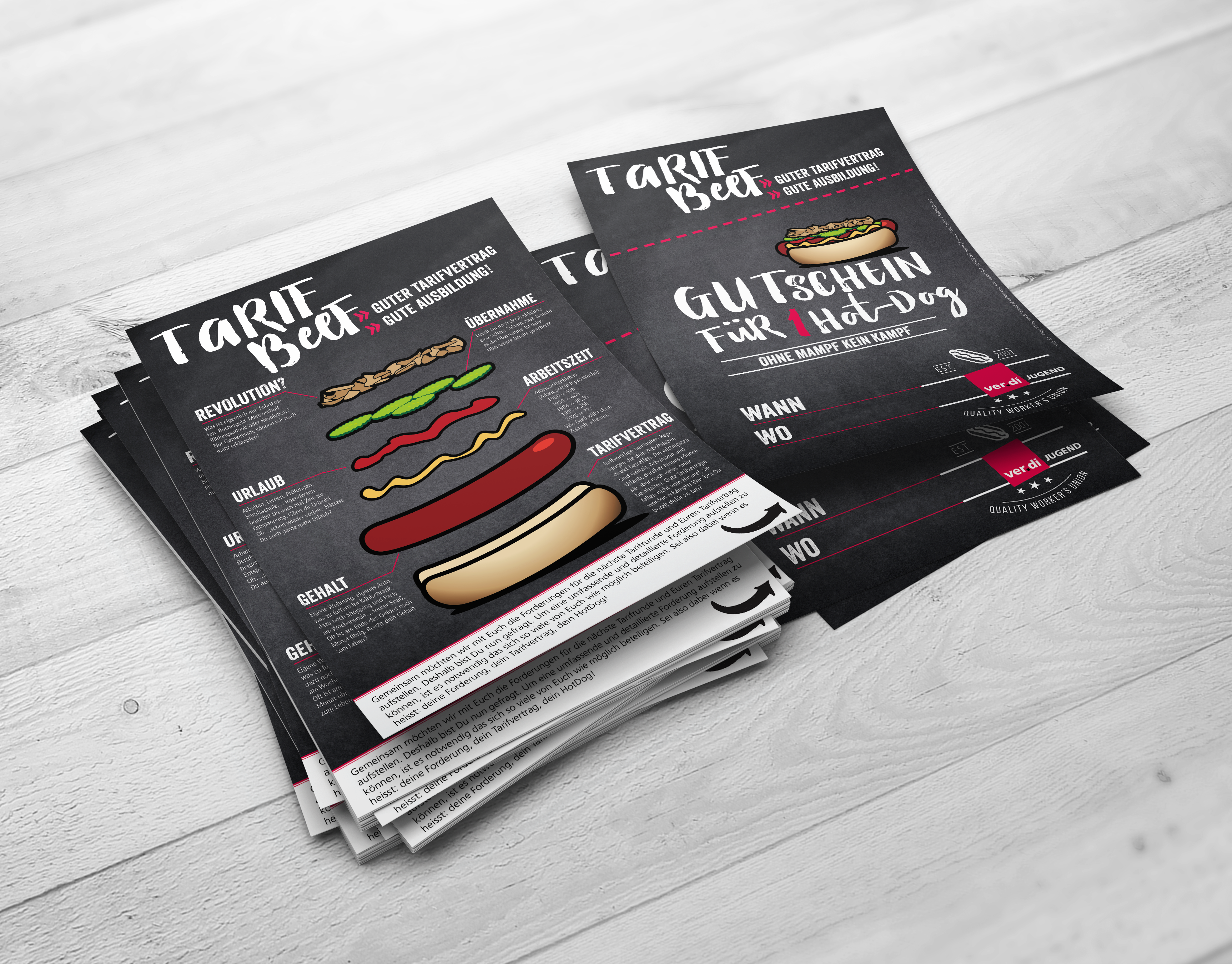 Im Rahmen der Aktionswoche Ausbildung wurden Flyer für das Tarif-HotDog benötigt. Denn Tarifverträge sind nur so stark wie ihre Einzelkomponenten.