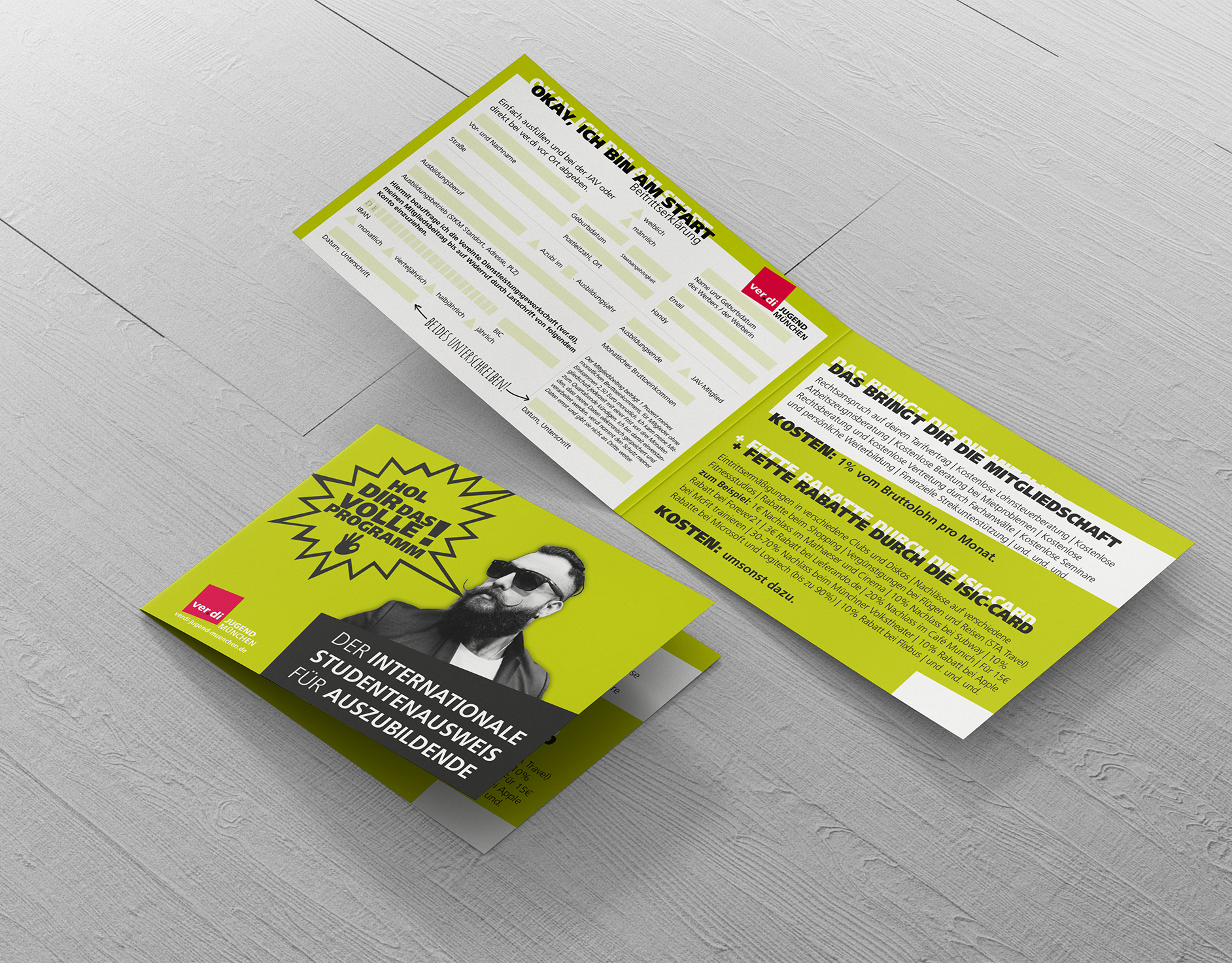 Um die Vorteile der ISIC Studenten-Karte für Auszubildende darzustellen wurde eine kleine DINA6 Klappkarte erarbeitet.