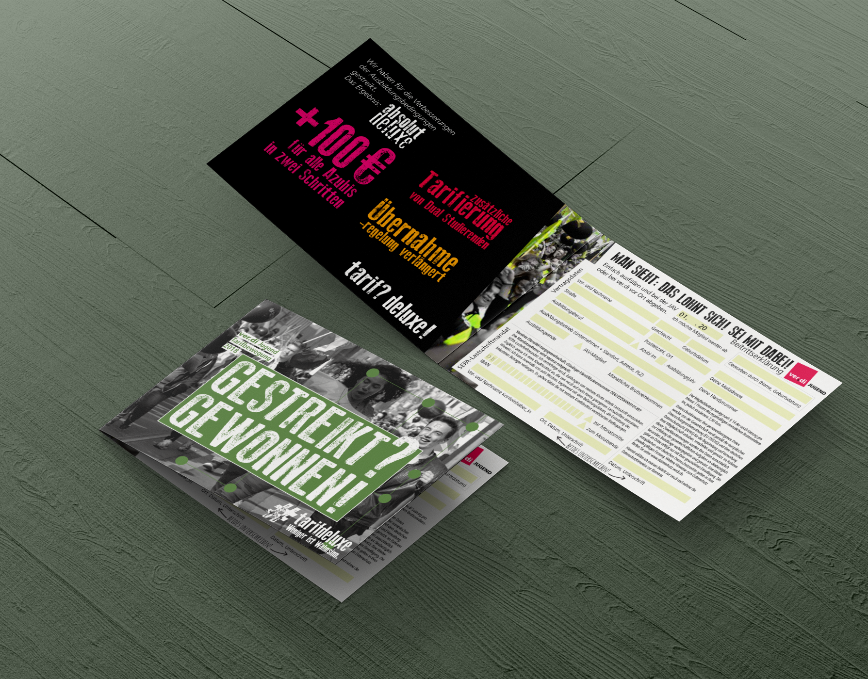 Um das Tarifergebnis für Auszubildende in den Bereichen das TVAöD zu erklären wurden kleine Klappkarten mit den wichtigsten Verbesserungen im neuen Tarifvertrag erstellt.