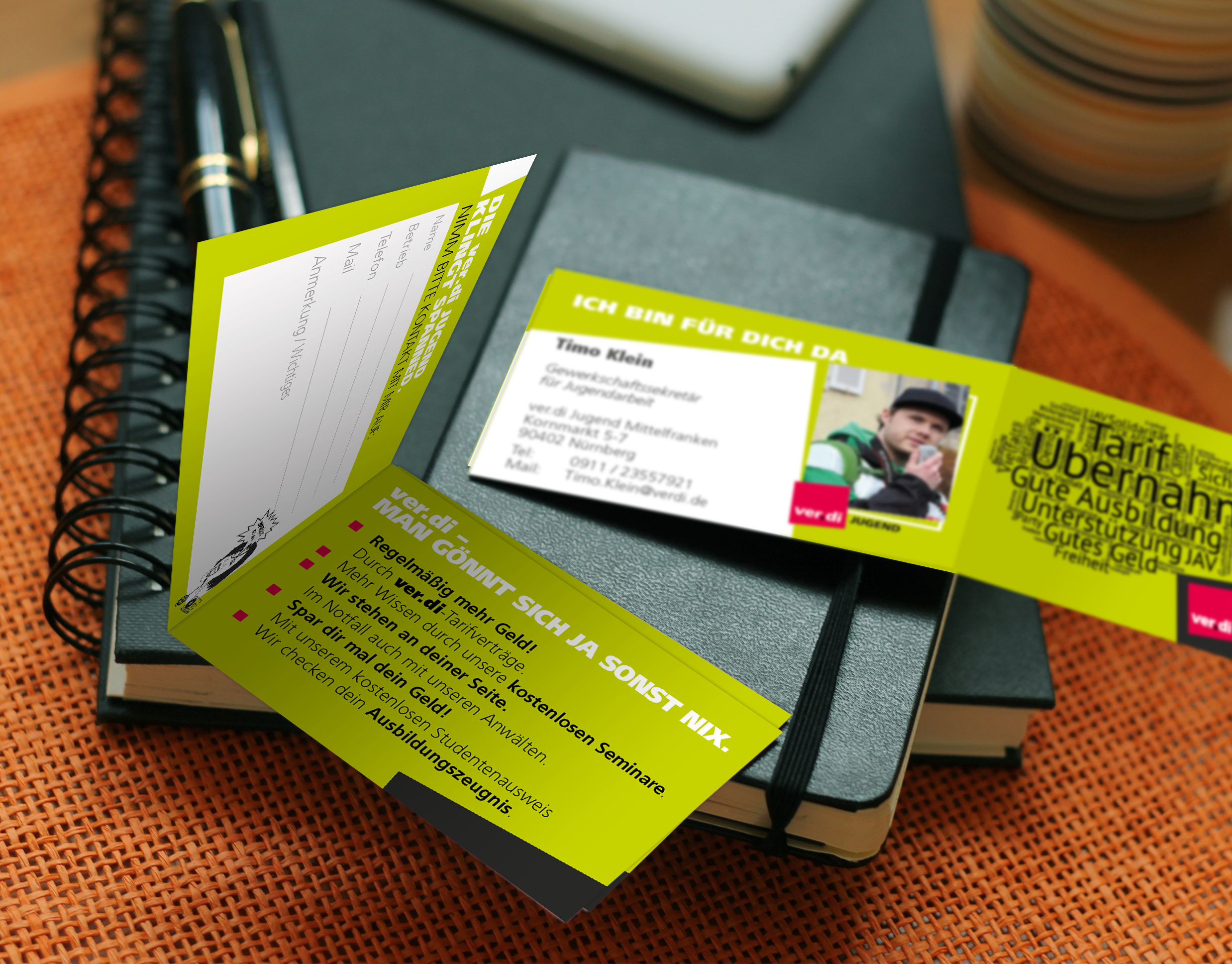 Für alle Jugendsekretäre in Bayern wurden verschiedene Klappvisitenkarten entworfen, die für die Kontaktaufnahme im Betrieb genutzt werden.